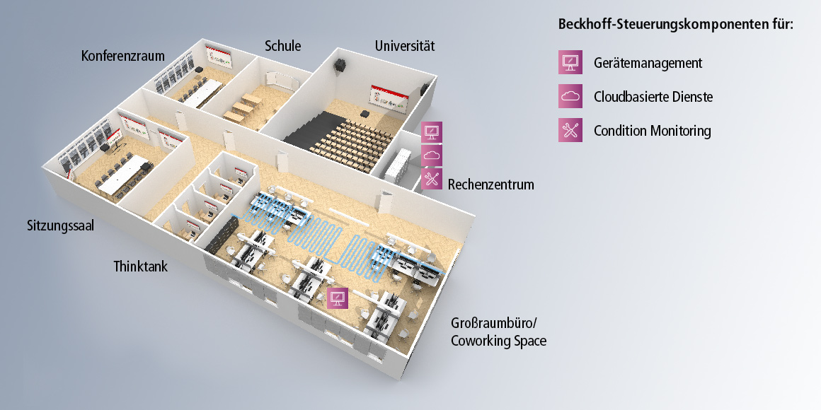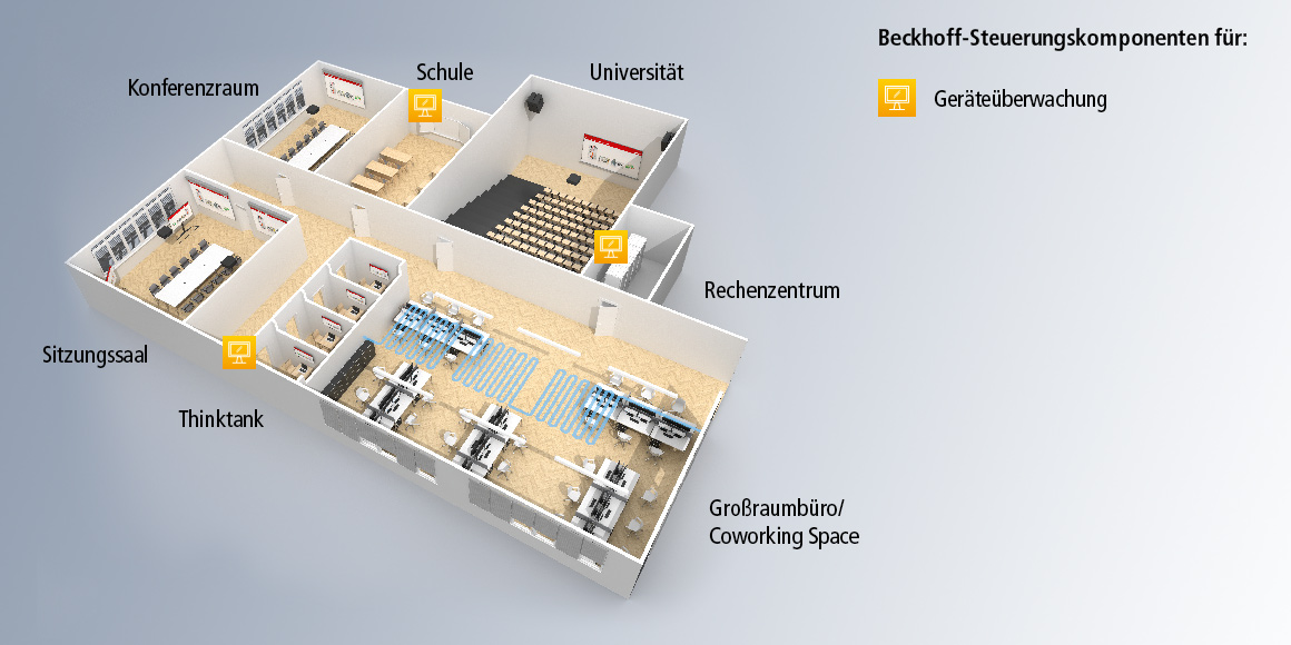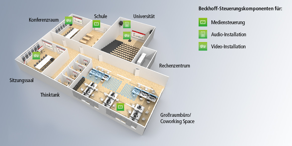 Ob Sitzungssaal, Konferenzraum, Thinktank, Großraumbüro, Coworking Space, Schule oder Universität – überall dort, wo es um optimale Arbeitsbedingungen für Meetings und Konferenzen geht, ist Technik im Spiel. Mit einer PC-basierten Steuerungslösung von Beckhoff lassen sich alle Gewerke auf einer Plattform integrieren, angefangen bei der Audio- und Videosteuerung über die verschiedenen Funktionen in der Gebäudeautomation bis zum Digital Signage und zum Bedienen und Beobachten.