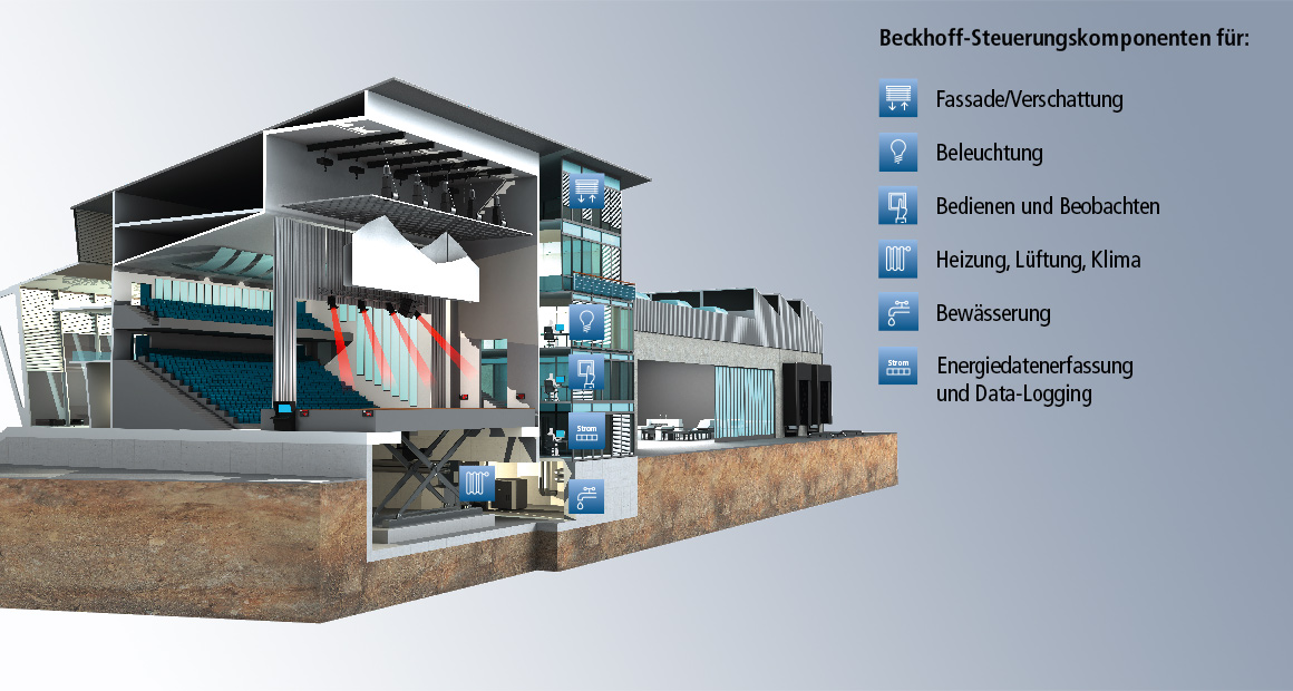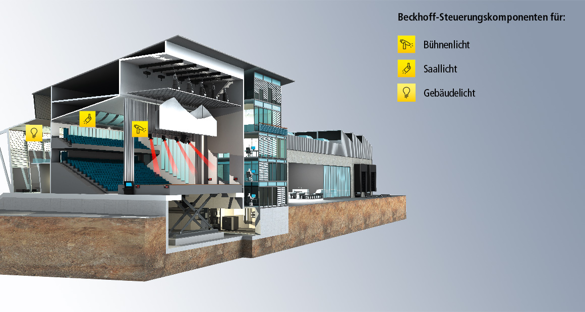 Ob Schauspiel- oder Opernhaus, Konzerthalle oder Musical-Theater, Kongress- und Mediencenter oder Kreuzfahrtschiff: Mit einer PC-basierten Steuerungslösung von Beckhoff lassen sich alle Gewerke stationärer Bühnendarbietungen auf einer Plattform integrieren: Sie umfasst bewegte Objekte (Bühnenmaschinerie, Kettenzüge, Winden, kinetische Objekte und animierte Figuren), Lichttechnik (Bühnenlicht, Lichteffekte, Saal- und Gebäudelicht), die AV -und Medientechnik (Audio- und Videoinstallationen, das Inspizientenpult, Interaktionen und Wassereffekte) sowie die Gebäudeautomation (Beleuchtung, Bedienen und Beobachten, Heizung, Lüftung, Klima, Fassadensteuerung und Energiedatenerfassung). Weltweit mit PC-based Control realisierte Steuerungsanwendungen in allen Bereichen stationärer Bühnentechnik belegen das fundierte Branchen-Know-how von Beckhoff.