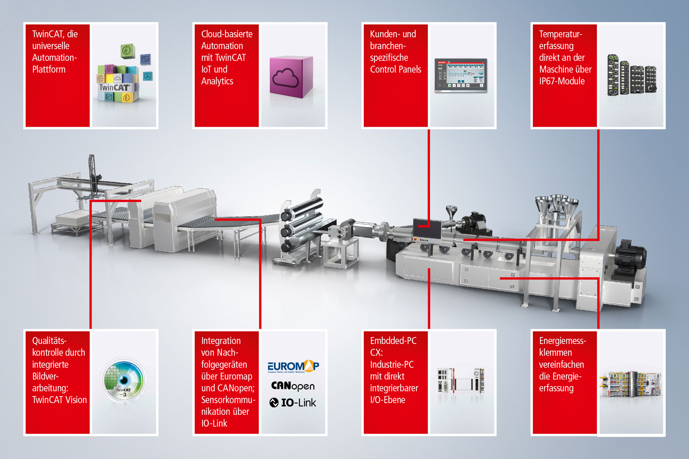 Das Beckhoff Steuerungsportfolio bietet die Grundlage für innovative Automatisierungskonzepte in der Extrusion. Neben der Steuerungstechnik für Extruder gibt es zahlreiche Anwendungsfelder bei den Nachfolgeeinrichtungen für Rohr- und Profilextruder sowie bei der Folienextrusion. Als Spezialist für diverse Feldbusvarianten auf Basis von EtherCAT stellt Beckhoff umfangreiche Optionen zur Einbindung von Subsystemen zur Verfügung.
