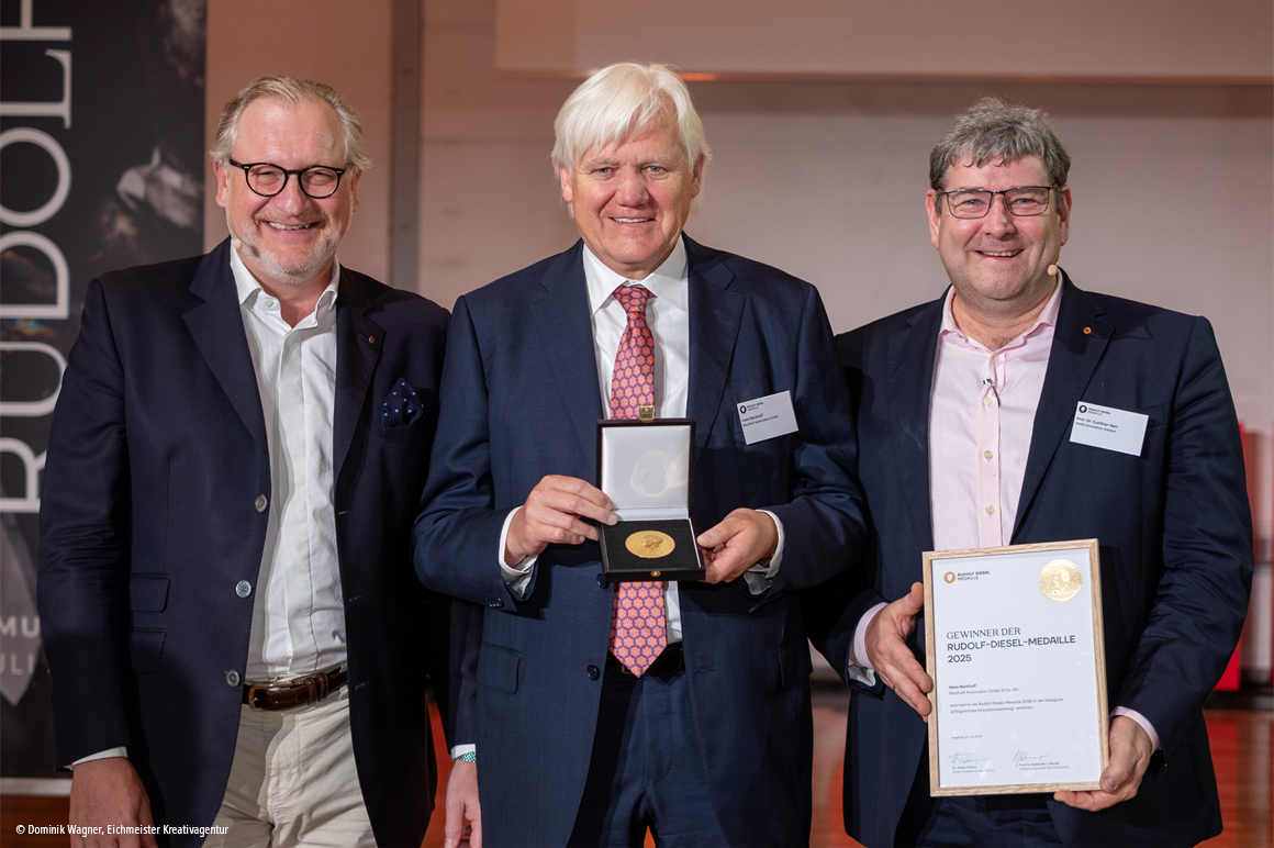 Die Medaille für die Kategorie „Erfolgreichste Innovationsleistung“ erhielt Hans Beckhoff (Mitte) von Alexander J. Wurzer (li.), Sprecher des Rudolf-Diesel-Kuratoriums, und Laudator Gunther Herr vom WOIS Institut und der Steinbeis University in Berlin.