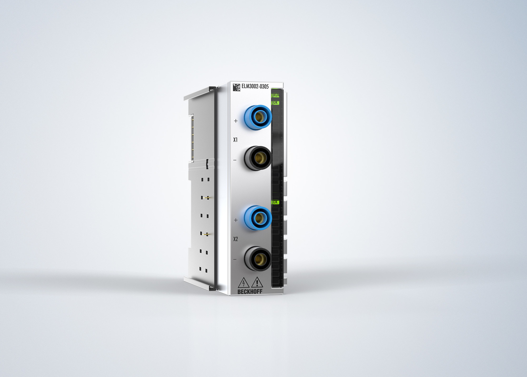 Mit den neuen ELM3002-0305/0405 steht eine genaue mV-Messung auf hohem Spannungsniveau bis 1.000 V zur Verfügung. Es werden sieben Spannungsmessbereiche von ±5 V bis ±60 mV unterstützt, geeignet für Einzelzellenmessung und Shunts. Beide EtherCAT-Messtechnikklemmen bieten einen Spannungsbereich von ±2,5 und ±5 V, 24-Bit-Auflösung und 50 kSps pro Kanal sowie ±200 ppm Genauigkeit. Die Version -0305 verfügt über zwei galvanisch getrennte Analogeingangs-Kanäle zur mV-Messung in zwei verschiedenen Stromzweigen. Mit Version -0405 kann hingegen über Kanal 1 die Spannung im Bereich bis ±1.200 V und über Kanal 2 der mV-Spannungsabfall über den Shunt-Widerstand gemessen werden.