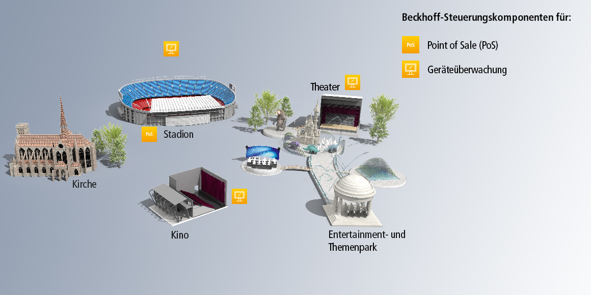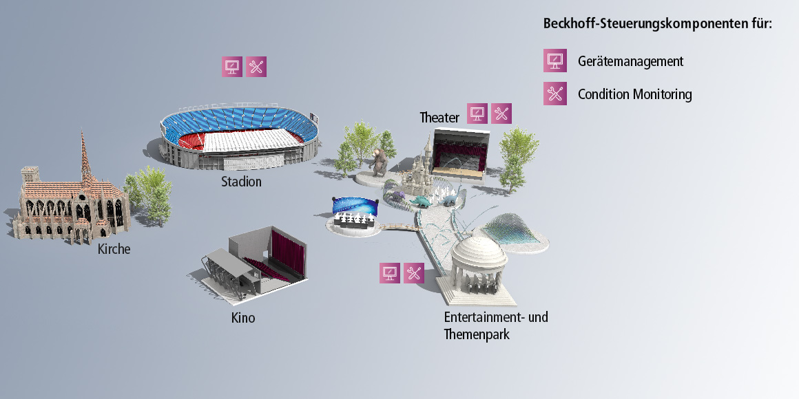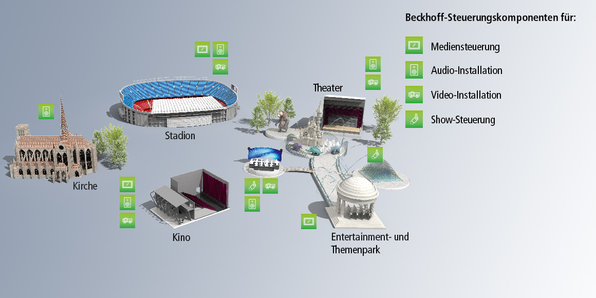Die Entertainment-Branche boomt weltweit; gleichzeitig wachsen die Ansprüche des Publikums an spektakuläre Inszenierungen und Spezialeffekte. Ob Fußballstadion oder Entertainment-Park, Theater, Kino oder Museum – Besucher erwarten perfekte Audio- und Videoübertragungen, magische Licht- oder Wassereffekte, spektakuläre kinetische Installationen und schnelle Bühnenumbauten. Dafür ist nicht nur die Kreativität von Künstlern und Designern gefragt, sondern auch eine flexible und zuverlässige Steuerungstechnik, die mit allen Medien und technischen Geräten kommunizieren kann. Als Spezialist für PC-based Control bietet Beckhoff einen modularen Komponentenbaukasten aus leistungsstarken Industrie-PCs, der Automatisierungssoftware TwinCAT, modularen I/O-Elementen sowie skalierbaren Antriebstechnikkomponenten.