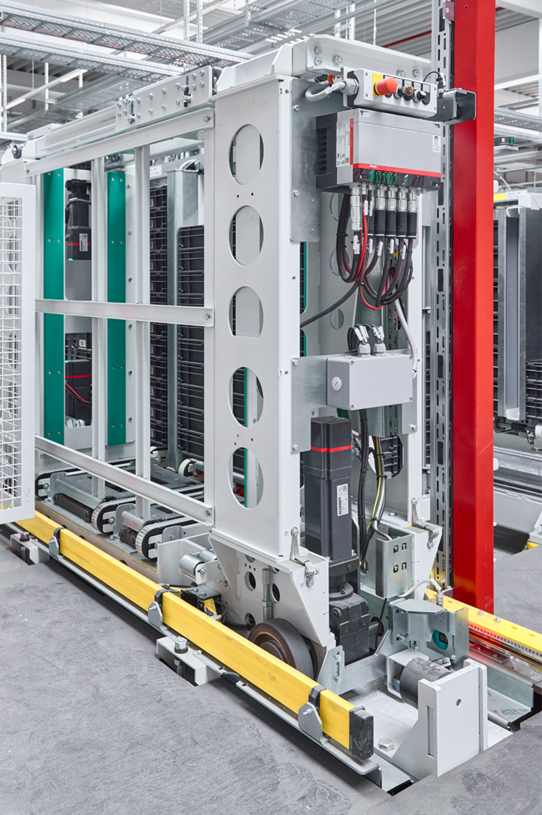 Ursprünglich überlegte Hüttenhölscher, die Shuttles über Energieketten in der Anlage anzubinden. Das ließ sich allerdings in den sehr schmalen Versorgungsgängen vom Platz her nicht umsetzen. Auch die geforderte Dynamik wäre über die langen Verfahrwege nicht erreichbar gewesen. Also musste eine andere Lösung gefunden werden. Die Versorgung des mobilen Systems mit 400 V realisierte der Anlagenbauer über eine Stromschiene. In der Folge sind nicht nur die beiden Fahrantriebe elektrisch, sondern auch die drei Achsen für die Aufnahme der Tray-Stapel. Auf Pneumatik wurde im Shuttle gänzlich verzichtet.