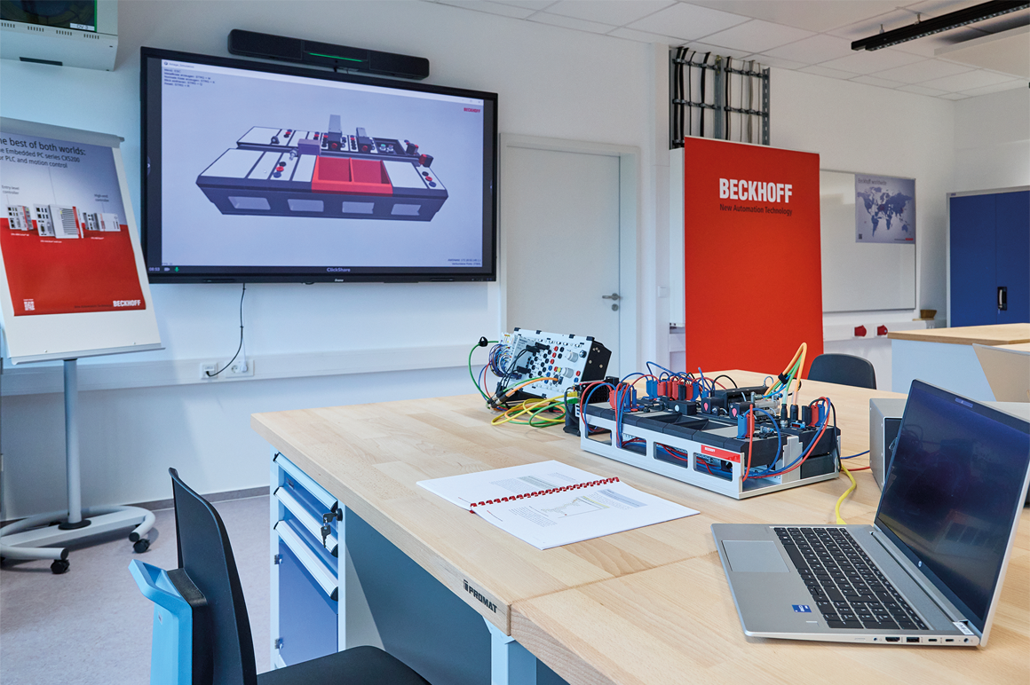 In den Laboren der Lehrfabrik wird mit der Ausstattung von Beckhoff auf Basis der PC-basierten Steuerungstechnik die Ansteuerung von Elektromotoren und Pneumatik-Zylindern vermittelt. Diese Komponenten kommen in der Lehrfabrik auch in den Maschinen der Fertigungsstraße zum Einsatz. Dadurch haben die Lernenden die Möglichkeit, das im Laborumfeld erworbene Wissen auf eine reale Produktionsumgebung zu übertragen. Die Fertigungsstraße der Lehrfabrik bildet alle wesentlichen Schritte der Möbelfertigung realitätsgetreu ab – vom Wareneingang und Zuschnitt der Einzelteile über die Kantenbearbeitung und Montage bis hin zu Qualitätskontrolle, Verpackung und Versand der gefertigten Möbel oder Möbelteile. Der große Vorteil der Lehrfabrik liegt im Praxisbezug, durch den die Auszubildenen sich schnell und problemlos in die Fertigungsabläufe ihres Unternehmens einarbeiten können.