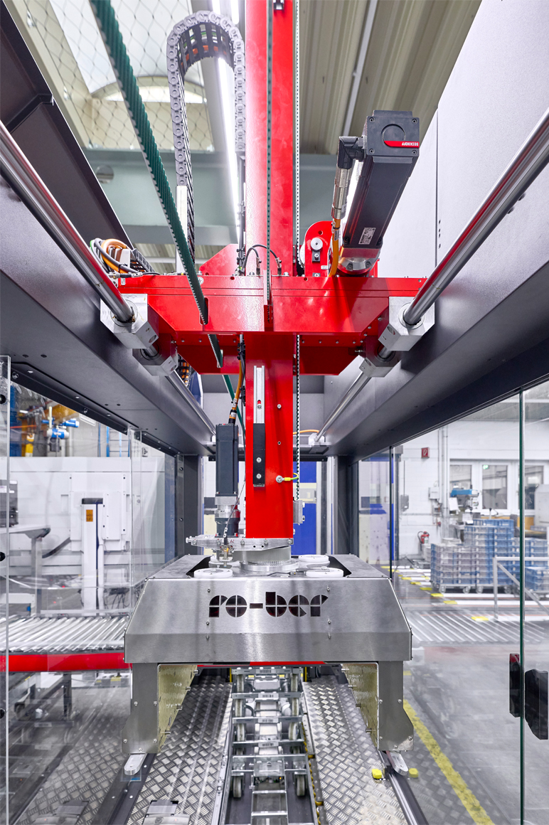 The linear robot from RO-BER handles heavy containers fully automatically, ensuring the safety of Bürkert’s logistics staff.