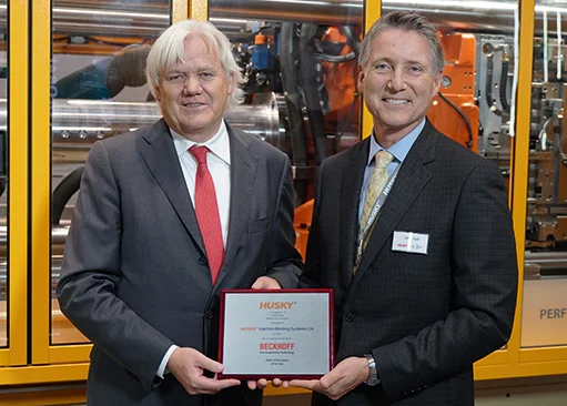 VERL, Germany, December 11, 2019 – The type of fruitful development partnership and trusting, reliable relationship that has existed between Canadian machine manufacturer Husky Injection Molding Systems and control system supplier Beckhoff for roughly 20 years is a rarity these days. Husky recently underscored this by honoring Beckhoff with its EMEA Supplier Award at the K 2019 trade show held in Düsseldorf, Germany, in October.