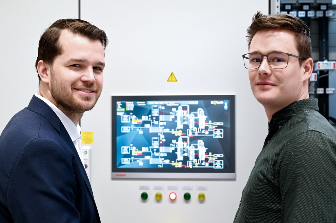 Reinoud van Bennekum (sales engineer at Beckhoff Netherlands – left) and Dylan Veelers (project engineer at Byosis – right) pictured with the central control cabinet with a CP2921 multi-touch Control panel