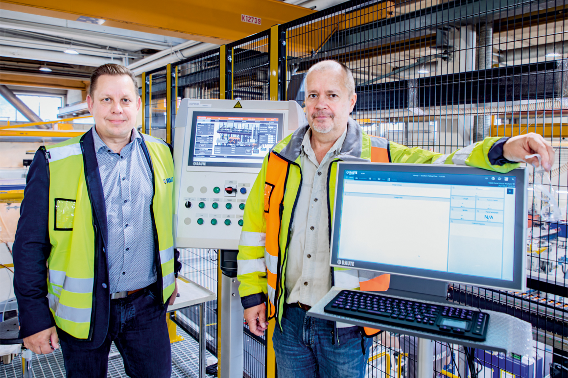 Erkki Kauranen, Business Line Manager for Veneer Repair, Panel Repair, and Panel Processing at Raute, and Janne Suhonen, Key Account Manager at Beckhoff Finland, in front of the Panel Repair Station R5 (from right to left)