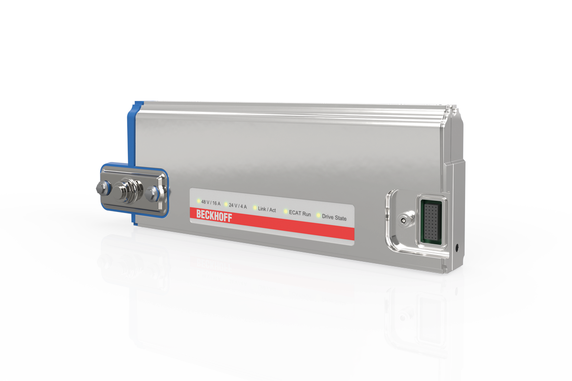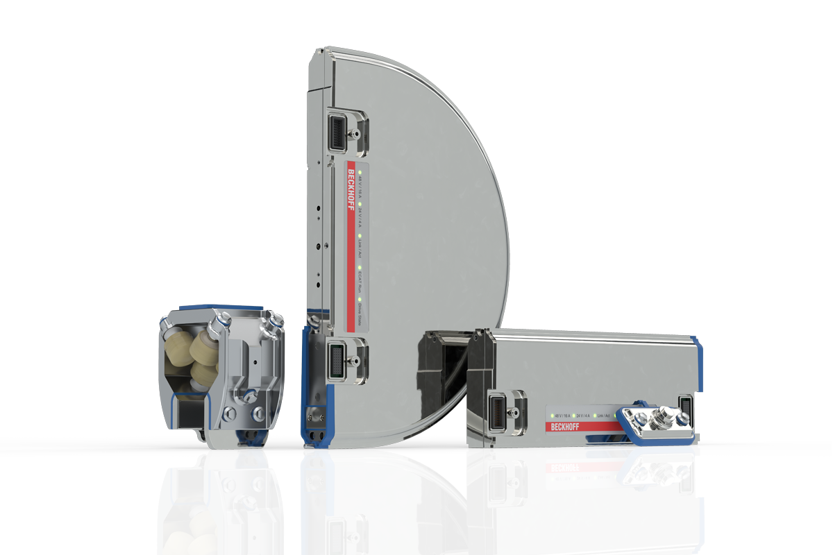 A stainless steel housing shell protects the electronics. Lateral plug contacts for power and communication transmission make it particularly easy to connect the modules. A cover, which contains the necessary connection contacts, connects two motor modules together securely and can also serve as a power supply point. This enables flexible adjustment of the power supply points without needing to dismount the motor modules.